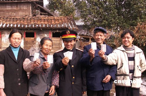 2月8日,凱里車務(wù)段職工上門為凱里市紅巖村村民吳章海等送來預(yù)定返程火車票。近日,貴州連續(xù)出現(xiàn)了50年罕見的冰凍,為確保農(nóng)民工按時(shí)拿到火車票,成都鐵路局凱里車務(wù)段開展了多項(xiàng)便民措施,確保返程農(nóng)民工不但走得了而且走得好,真正做到“平安和諧”春運(yùn)。中新社發(fā) 姜澤鵬 攝
