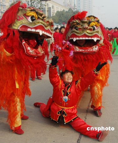 2月7日,舞獅隊(duì)在街頭巡游表演鬧新春。當(dāng)天農(nóng)歷正月初一,安徽蕪湖市社區(qū)居民組成秧歌、龍燈、舞獅、彩船、腰鼓、花籃隊(duì)踏歌踩街巡游表演鬧新春,一路引來(lái)眾多游人觀賞。中新社發(fā) 陳立希 攝
