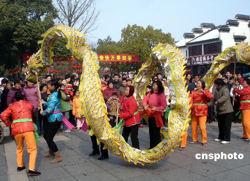 2月8日農(nóng)歷大年初二,一支由蘇州古鎮(zhèn)同里農(nóng)村婦女組成的舞龍表演隊(duì)在同里鎮(zhèn)退思廣場上表演,給節(jié)日的古鎮(zhèn)增添了濃濃的喜慶氣氛,吸引了眾多古鎮(zhèn)居民和中外游客觀看。中新社發(fā) 王建康 攝