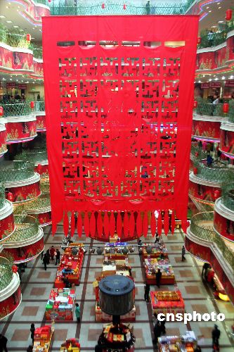 2008年2月9日,沈陽(yáng)商業(yè)城共享大廳空中高懸有四層樓高、用紅綢布特制的巨大“掛簽”,上面還剪刻了栩栩如生的米老鼠,以歡度新春佳節(jié)。 中新社發(fā) 劉寶成 攝