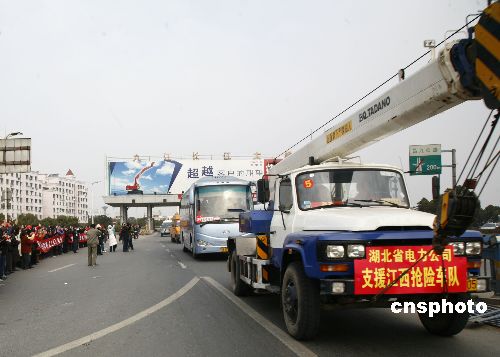2月10日上午11時許,由171輛車組成的湖北支援江西電網(wǎng)的搶修車隊通過九江長江大橋抵達江西,搶修人員將趕赴咸夢線的搶修工地,修復咸夢線江西段134公里長受損電網(wǎng)。中新社發(fā) shendudu 攝