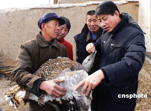 2月9日,一只國(guó)家一級(jí)瀕危保護(hù)鳥(niǎo)類(lèi)在滄州被成功救治。大年初一上墳祭祖的河北黃驊常郭鄉(xiāng)齊趙村的齊延平老人在菜地里發(fā)現(xiàn)了一只受傷的大鳥(niǎo),出于對(duì)保護(hù)鳥(niǎo)類(lèi)的重視齊延平老人將受傷的大鳥(niǎo)抱回了家中,出于好奇前來(lái)觀看的鄉(xiāng)親們中間有人通過(guò)互聯(lián)網(wǎng)得知了這是國(guó)家一級(jí)瀕危保護(hù)鳥(niǎo)類(lèi)大鴇,于是齊延平老人通過(guò)多方打聽(tīng)終于在大年初三這天聯(lián)系到了滄州師專(zhuān)生物系教授、滄州野生動(dòng)物救護(hù)中心負(fù)責(zé)人孟德榮,孟教授當(dāng)即從滄州乘出租車(chē)趕到100公里外齊延平老人家前來(lái)接治受傷大鴇。據(jù)孟教授介紹,這只大鴇翅膀出現(xiàn)了不同程度的撕裂傷,其受傷主要原因是因?yàn)檎`食了有毒食物所致,目前受傷大鴇以被接回滄州野生動(dòng)物救護(hù)中心進(jìn)行進(jìn)一步的救治。中新社發(fā) 楊志濤 攝