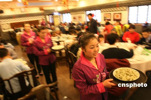 2月11日,北京惠豐餃子樓的服務(wù)員給顧客上餃子。當(dāng)日是農(nóng)歷正月初五,俗稱“破五”,民間素有吃餃子的習(xí)俗。從中午開始,北京許多餃子館生意紅火,一些市民通過吃餃子寄托對(duì)幸福生活和美好明天的期盼。中新社發(fā) 陳曉根 攝