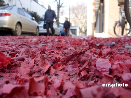 2月13日是正月初七,蘇州許多商家在節(jié)后營(yíng)業(yè)第一天燃放“開門炮”,許多街道上一地紙屑。 中新社發(fā) 王建康 攝