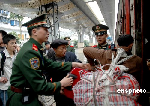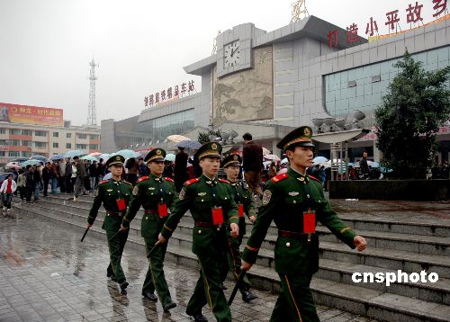 2月14日上午,武警官兵在四川廣安火車站維護民工回流秩序。據(jù)悉,2月8日開始,該火車站便迎來民工返程高峰,平均每天外出民工流量達1萬余人次。武警廣安支隊派出30名官兵,維護車站秩序。中新社發(fā) 邱海鷹 攝