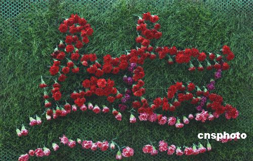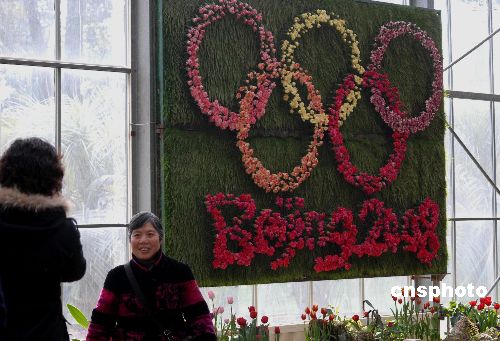 2008年2月14日,湖北武漢市植物園用數(shù)千朵康乃馨組成的北京2008奧運會五環(huán)圖案和各種栩栩如生的體育比賽項目圖案,吸引了前來賞花游園的市民。中新社發(fā) 楚天行 攝