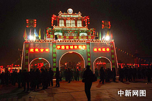 節(jié)日里的平遙古城流光溢彩,燈彩迷人,各色燈組為當(dāng)?shù)鼐用窈椭型庥慰蛶砹藦?qiáng)烈的視覺沖擊和心靈震撼。裴旭亮 攝