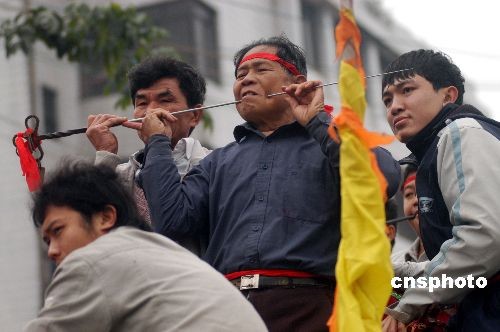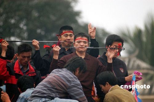 2008年2月16日,瓊海市,祈求五谷豐登,風(fēng)調(diào)雨順!败娖隆笔呛D厦耖g的一個(gè)傳統(tǒng)節(jié)日,相傳源于唐代,為紀(jì)念六世紀(jì)我國嶺南著名俚人首領(lǐng)冼夫人而舉行的祭祀活動(dòng),距今已有1300多年歷史。獨(dú)特的民俗風(fēng)情吸引了大批游客。中新社發(fā) 蒙鐘德 攝