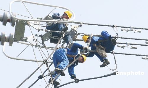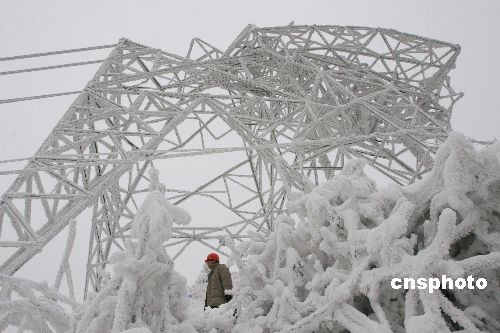 2月23日,全國第一條因暴雪災害,導致輸電線路鐵塔倒塌的三峽電力送往華東的大動脈±500千伏湖北宜昌至上海華新直流輸電線路,安徽境內(nèi)搶修工作全部接束,中斷37天的500千伏宜華線恢復貫通。1月17日,該輸電線路﹟1146-﹟1153段4座位于大別山腹地安徽六安境內(nèi)崇山峻嶺中的巨型鐵塔被冰雪壓塌,線路嚴重受損。災害發(fā)生后,安徽省電力公司500多名搶險人員和當?shù)財?shù)百干部群眾克服天寒地凍、山路陡峭等困難,奮力搶修,經(jīng)過37天艱苦奮戰(zhàn),運送搶險物資150多噸,終于將4座倒塌鐵塔重新修建完成,宜華線路全線貫通。中新社發(fā) 陳超平 攝