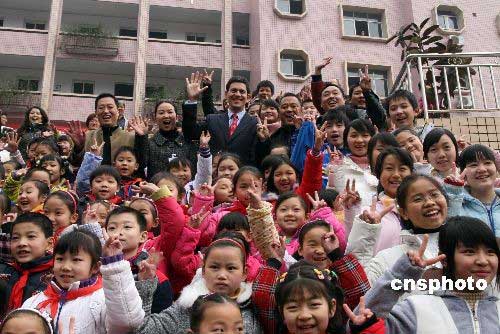 2月27日,英國外交大臣戴維·米利班德與農(nóng)民工子女合影留念。戴維·米利班德一行于26日抵達重慶開始為期兩天的訪問,這是他上任以來首次訪華。中新社發(fā) 郭晉嘉 攝