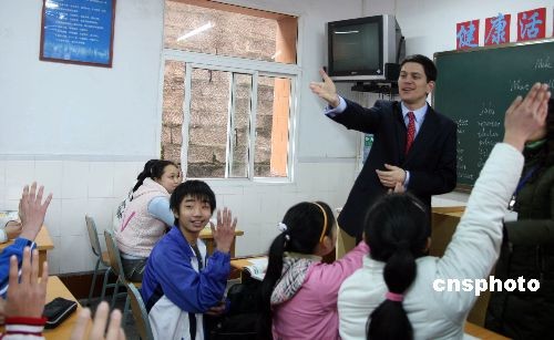2月27日,英國外交大臣戴維·米利班德與重慶農(nóng)民工子女同上英語課,學(xué)生們爭相與他交流。戴維·米利班德一行于26日抵達重慶開始為期兩天的訪問,這是他上任以來首次訪華。中新社發(fā) 郭晉嘉 攝