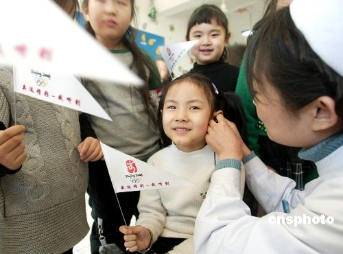 2月29日,河北滄州市人民醫(yī)院的醫(yī)護(hù)人員為幼兒園的兒童進(jìn)行聽力測試。為迎接第九次全國愛耳日,滄州市人民醫(yī)院耳鼻喉科的醫(yī)護(hù)人員結(jié)合主題“奧運(yùn)精神-我聽到”,組織了以“健康聽力,綠色奧運(yùn)”為口號的義診活動。在為期半天的活動中,醫(yī)護(hù)人員先后為100余名兒童進(jìn)行了聽力測試,并做了預(yù)防耳病基礎(chǔ)知識的宣傳。中新社發(fā) 郭金明 攝