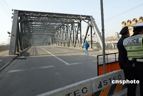 3月1日零時,上海外白渡橋準時封閉交通,它的整修工程也將隨之展開,擇日整體移入工廠進行大修。中新社發(fā) 湯彥俊 攝