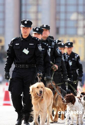 3月2日,全國政協(xié)第十一屆一次會(huì)議預(yù)備會(huì)議在北京人民大會(huì)堂舉行,安保人員攜警犬在天安門廣場巡邏,以確保會(huì)議順利進(jìn)行。中新社發(fā) 盛佳鵬 攝