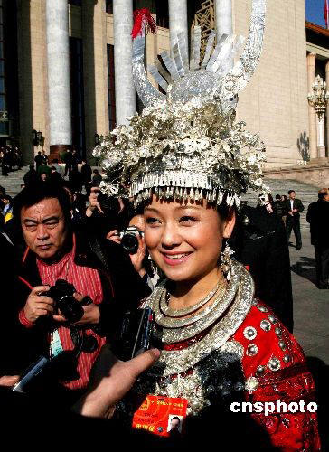 3月4日上午,十一屆全國人大一次會議舉行預備會,來自貴州黔東南地區(qū)的苗族姑娘雷阿幼朵備受記者關(guān)注。 中新社發(fā) 王輝 攝
