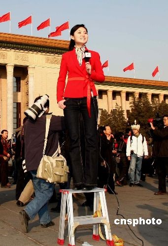 圖:女記者登高報(bào)道人大一次會(huì)議