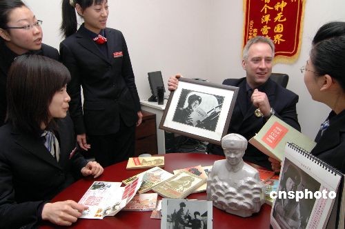 3月5日,“洋雷鋒”羅杰斯在“外國人學(xué)雷鋒我們怎么辦?”活動中展示自己收藏品。遼寧省錦州市商業(yè)銀行凌云支行外籍員工、美國人羅杰斯不但崇拜雷鋒,而且對學(xué)雷鋒情有獨鐘,收藏數(shù)百件有關(guān)雷鋒的物品,而且翻譯了雷鋒日記。他在工作、生活中堅持用雷鋒精神要求自已,做了很多有意義的事,為弘揚傳承雷鋒精神寫了大量文章,羅杰斯說雷鋒精神是一種超越國界、超越時空、超越意識形態(tài)的精神。中新社發(fā) 李鐵成 攝
