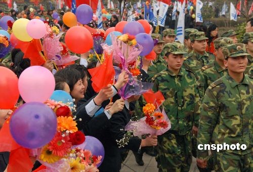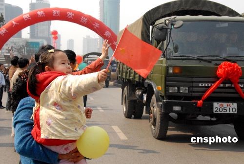 2008年3月5日,貴陽市人民廣場,援黔抗凝凍部隊返程受到社會各界人民群眾夾道歡送。據(jù)悉,貴州省在受凝凍災(zāi)害期間,得到中國人民解放軍及社會各界的援助,電力搶修按預期提前190余天完成,目前貴州送往省外的電路全部投入送電。中新社發(fā) 張?zhí)炝?攝