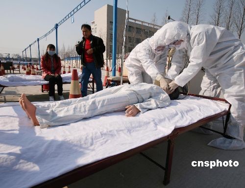 3月5日,安徽蒙城縣舉行人禽流感防治應(yīng)急處置演練,從縣衛(wèi)生醫(yī)療機(jī)構(gòu)抽調(diào)的有關(guān)人員分別參加了人員防護(hù)著裝與卸裝、病人就診、疫情報(bào)告、醫(yī)療救治、院內(nèi)疫情流調(diào)防控及病人救治、病人居住地疫情防控、應(yīng)急處置等七個(gè)部分的實(shí)地演練。據(jù)悉,演練旨在檢驗(yàn)人禽流感防治預(yù)案的可操作性和執(zhí)行效果,測(cè)試醫(yī)療衛(wèi)生機(jī)構(gòu)衛(wèi)生應(yīng)急及醫(yī)療救助能力,提高全縣應(yīng)對(duì)突發(fā)公共衛(wèi)生事件應(yīng)急處置能力。中新社發(fā) 胡衛(wèi)國(guó) 攝