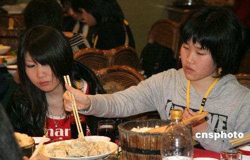 3月10日晚,來自日本石川縣、滋賀縣的高中生代表團(tuán)在山城重慶一家餐館用餐,一位女高中生對(duì)桌上的餃子饒有興趣。今年是中日兩國(guó)領(lǐng)導(dǎo)人共同確定的“中日青少年友好交流年”,日本此次訪華的青少年友好使者代表團(tuán)一行共一千人,分赴上海、重慶、廣州、成都、杭州、大連等地訪問交流。中新社發(fā) 孫自法 攝