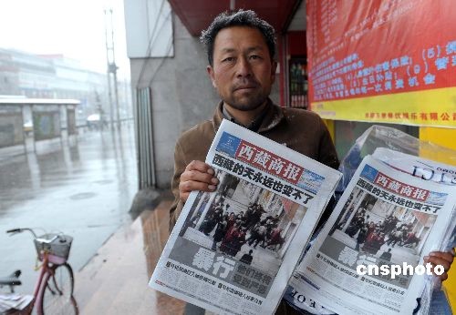 3月21日,一名拉薩市民頂著風(fēng)雪在拉薩街頭售賣揭露不法分子打砸搶燒罪行的報(bào)紙。拉薩市3月14日發(fā)生的打砸搶燒嚴(yán)重暴力犯罪事件,給當(dāng)?shù)厝嗣袢罕娚?cái)產(chǎn)造成重大損失,使當(dāng)?shù)厣鐣?huì)秩序受到嚴(yán)重危害。中新社發(fā) 廖攀 攝