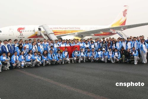 4月1日,剛剛從希臘運(yùn)送圣火火種回京的圣火包機(jī)“奧運(yùn)圣火號(hào)”再度起飛,攜圣火火種前往哈薩克斯坦的阿拉木圖。北京奧運(yùn)會(huì)圣火將從那里開始境外傳遞的首航。北京時(shí)間四月二日,奧運(yùn)圣火將在阿拉木圖進(jìn)行六個(gè)小時(shí)的傳遞。圖為北京奧運(yùn)火炬?zhèn)鬟f運(yùn)行團(tuán)隊(duì)在包機(jī)前合影。中新社發(fā) 沈晨 攝