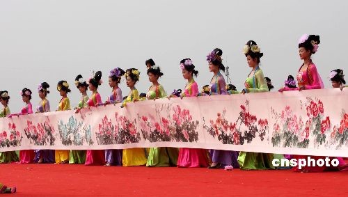 四月十日上午,河南省第二十六屆洛陽牡丹花會(huì)開幕慶典在該市新區(qū)體育中心廣場舉行。開幕式上,一百五十米長填色牡丹畫被英國吉尼斯總部和中國地區(qū)認(rèn)證官員,當(dāng)場認(rèn)證為世界最長的填色牡丹畫。中新社發(fā) 王中舉 攝