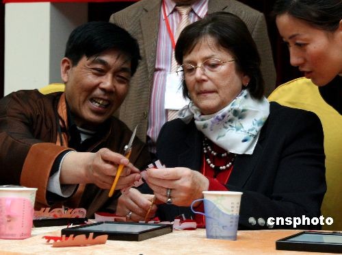 4月10日上午,國際奧委會主席羅格夫人在北京參觀京城百工坊時,向百工坊剪紙大師學習中國傳統(tǒng)剪紙藝術(shù)。中新社發(fā) 宋吉河 攝