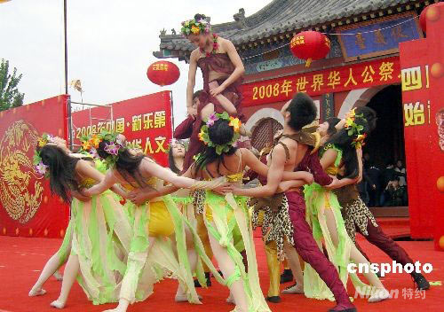 22日,第四屆伏羲文化旅游節(jié)在“羲皇圣里”河北省新樂市開幕。來自美國、加拿大、臺灣、香港等國家和地區(qū)的萬余名華人代表、學術社團代表、伏羲文化專家、易學專家、各地客商及當?shù)孛癖婟R聚“伏羲臺”,舉行2008年世界華人公祭人文始祖伏羲大典。新樂自古有“羲皇圣里”之稱,商周以來,這里就是世界華裔同胞尋根祭祖的圣地,每年陰歷三月十八的伏羲廟會,香火鼎盛,連綿不絕,延續(xù)至今。圖為祭祀大典當中的樂舞告祭。中新社發(fā) 牛琳 攝