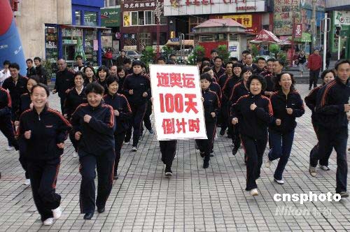 4月29日,新疆電影公司50余名職工手舉“迎奧運100天倒計時”牌匾,在新疆烏魯木齊市街頭舉行長跑活動。同時,為期5天的趣味運動會也拉開帷幕,其中包括長跑、踩氣球、乒乓球等項目,為即將到來的北京奧運會吶喊助威。中新社發(fā) 劉新 攝