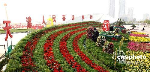 4月30日,天津市有關(guān)部門在銀河廣場擺放的以“天津人民喜迎奧運”為主題的巨型花壇亮相,使銀河廣場更靚,給即將到來的“五一”節(jié)增添了歡樂、祥和和喜慶氣氛。中新社發(fā) 李勝利 攝