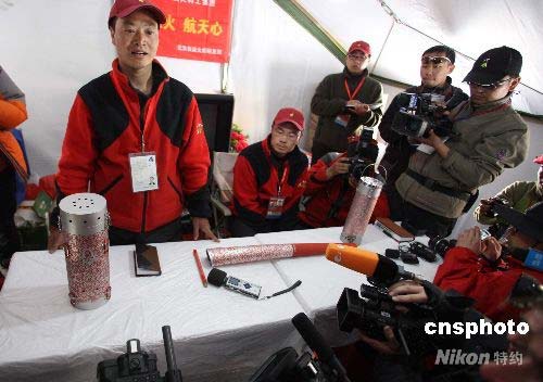 4月30日,受邀采訪(fǎng)2008北京奧運(yùn)會(huì)火炬接力珠峰展示活動(dòng)的中外媒體記者,集體在珠峰大本營(yíng)探營(yíng)。中國(guó)航天科工集團(tuán)北京奧運(yùn)火炬研發(fā)部有關(guān)負(fù)責(zé)人,向中外媒體揭秘奧運(yùn)火炬接力珠峰展示活動(dòng)所使用的珠峰火種燈、珠峰火炬、珠峰引火器。中新社發(fā) 盛佳鵬 攝