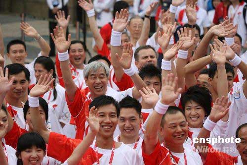 五月三日,二零零八北京奧運(yùn)圣火在澳門(mén)傳遞,這是京奧圣火境外傳遞的最后一站,也是澳門(mén)開(kāi)埠以來(lái)首次迎接奧運(yùn)圣火。圖為參加傳遞的火炬手向觀眾致意。中新社發(fā) 武仲林 攝