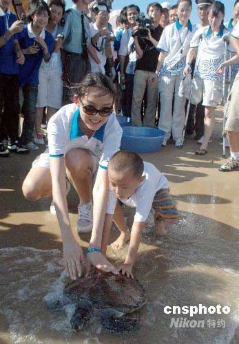 北京奧運(yùn)會火炬接力海南省傳遞五月四日傳遞將在三亞首發(fā)。三日,聯(lián)想和"藍(lán)絲帶"在三亞組織保護(hù)海洋活動,倡導(dǎo)綠色奧運(yùn)。圖為世界小姐張梓琳和孩童在三亞灣海邊放歸大海龜。中新社發(fā) 王辛莉 攝