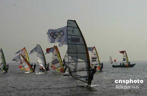 5月6日上午8時(shí)10分,北京奧運(yùn)圣火在海南省?谑袀鬟f,為海南省奪得首枚全運(yùn)會(huì)金牌的女子帆板運(yùn)動(dòng)員王麗芳傳遞第一棒火炬。圖為海口西海岸海上帆板隊(duì)掛滿奧運(yùn)五環(huán)旗祝賀奧運(yùn)圣火在?趥鬟f。中新社發(fā) 尹海明 攝