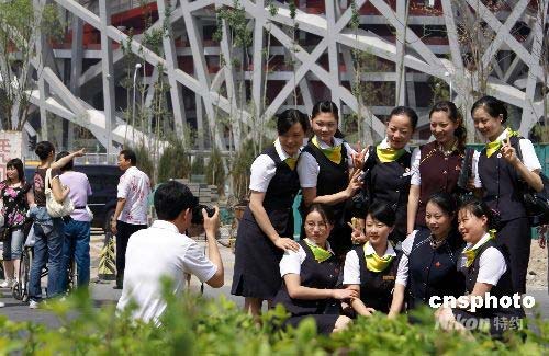 2008年5月8日上午,人們?cè)凇傍B(niǎo)巢”拍照留念。當(dāng)天中國(guó)登山隊(duì)隊(duì)員將奧運(yùn)圣火成功送上珠峰,創(chuàng)造了奧運(yùn)圣火首次登頂世界最高峰的紀(jì)錄。北京國(guó)家體育場(chǎng)(“鳥(niǎo)巢”)周圍聚滿了市民和各地游客,人們紛紛到此拍照留影,紀(jì)念北京奧運(yùn)圣火成功登頂珠峰。一些國(guó)外媒體特意在報(bào)道“鳥(niǎo)巢”周圍喜慶的奧運(yùn)氣氛。中新社發(fā) 馬小剛 攝