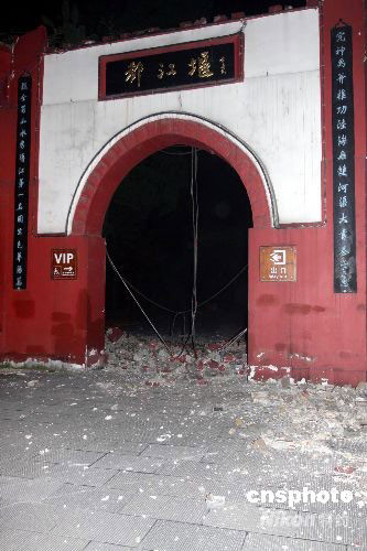 5月12日14時28分,在四川汶川縣(北緯31度,東經(jīng)103.4度)發(fā)生7.8級地震。都江堰市區(qū)受地震災(zāi)害影響嚴重,多處房屋倒塌。圖為都江堰景區(qū)受損的大門。 中新社發(fā) 黃榮 攝