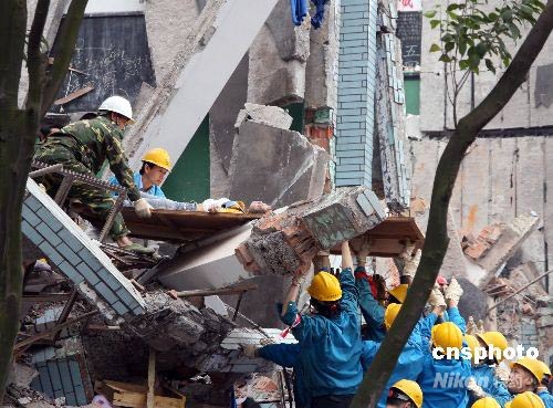 5月13日中午,四川省綿竹市漢旺鎮(zhèn)東方汽輪機廠子弟學(xué)校——東汽中學(xué)的垮塌校舍里,被困近一天的學(xué)生被救出。12日,四川汶川縣發(fā)生7.8級地震,而漢旺鎮(zhèn)與汶川僅一山之隔,距離30余公里,受到嚴重破壞。中新社發(fā) 郭晉嘉 攝