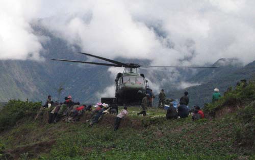 首批救援直升機14日上午成功降落此次地震震中汶川縣城,新華社記者 徐壯志 攝。