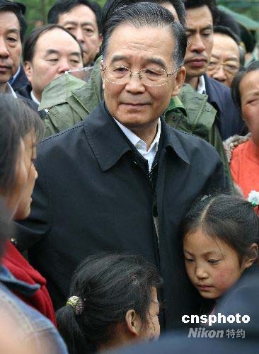 中國總理溫家寶十四日上午來到四川省北川縣看望受災(zāi)群眾,在他向群眾講話時,雙手一直緊緊摟著兩個從北川中學塌陷的教學樓中逃生出來的孩子。中新社發(fā) 孫宇挺 攝