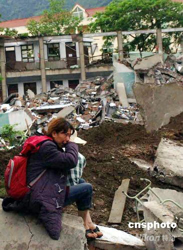 5月14日,在四川地震重災(zāi)區(qū)北川縣,一位學(xué)生家長坐在廢墟中哭泣。當(dāng)日,營救人員正在奮力搜救北川中學(xué)被困學(xué)生。在5·12地震中,該校兩棟5層樓房坍塌。中新社發(fā) 鄒憲 攝