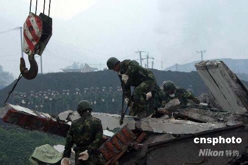 5月14日,中國空降兵某部已出動6500人在四川什邡縣境內(nèi)災(zāi)情最嚴(yán)重的洛水、紅白等地緊急搶救被困群眾。圖為空降兵戰(zhàn)士用鐵鉗剪斷鋼筋清混凝土救人。中新社發(fā) 譚超 攝