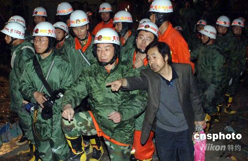 四川汶川縣5月12日發(fā)生7.8級(jí)地震后,北川縣北川中學(xué)受到極大的迫害,將近三千名的學(xué)生中僅有一半學(xué)生生存,另一部分學(xué)生因樓房倒塌而遇難或受傷?拐鹣狸(duì)員不顧艱險(xiǎn)連續(xù)工作,利用不同工具挖掘被壓人員,并及時(shí)成功搶救出一批學(xué)員。圖為綿陽一位建筑設(shè)計(jì)人員輔助施工人員進(jìn)行搶險(xiǎn)救災(zāi)。中新社發(fā) 鄒憲 攝