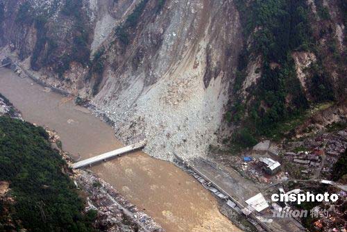 5月15日,在地震中中斷的汶川縣公路仍未完全修復(fù),這是當日航拍的垮塌公路橋梁。此次大地震中,位于震中的汶川縣附近道路受到嚴重破壞,救災(zāi)部隊、人員和醫(yī)療、生活物資遲遲不能從陸路進入。中新社發(fā) 張雷 攝