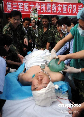 5月15日,解放軍第三軍醫(yī)大學(xué)“抗震救災(zāi)醫(yī)療隊”在四川地震災(zāi)區(qū)使用野戰(zhàn)手術(shù)車對受傷災(zāi)民進(jìn)行救治。據(jù)了解,這種野戰(zhàn)手術(shù)車可同時進(jìn)行兩臺手術(shù),車體內(nèi)配有呼吸機、麻醉機、心電監(jiān)護(hù)儀、多功能電切刀和空調(diào)等設(shè)備,為救治更多的傷員提供了保障。目前,該醫(yī)療隊已完成包括16例重癥顱腦損傷在內(nèi)的各類手術(shù)近200例。圖為一名受傷災(zāi)民成功接受手術(shù)后被送出野戰(zhàn)手術(shù)車。中新社發(fā) 范忠武 攝