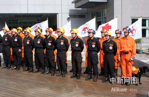 五月十六日下午,由臺灣紅十字會組織派遣的救援隊一行二十二人和一只搜救犬將乘包機直飛四川救災(zāi)。圖為戎裝即發(fā)的搜救隊和搜救犬。作者:陳立宇