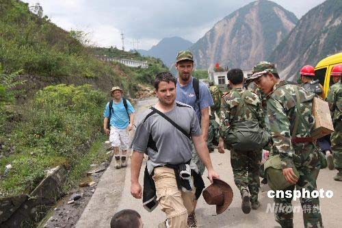 5月14日,從都江堰到汶川縣映秀鎮(zhèn)沿線民房和交通受損嚴重,許多受困的居民紛紛離家趕往安全地點,也有許多居民想回家看往地震區(qū)的親人。圖為受困的外國游客在前往安全地點的途中。中新社發(fā) 黃榮 攝