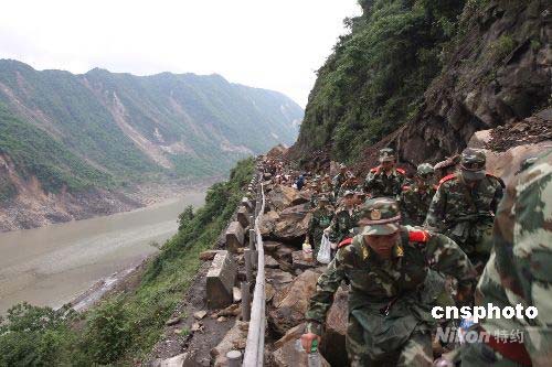 來自交通運(yùn)輸部的最新消息,從北、東、南三個(gè)方向通往汶川的道路目前仍在緊急搶修中。已全線搶通的西線道路因再次發(fā)生滑坡、泥石流災(zāi)害,受損十分嚴(yán)重,目前塌方路段能夠維持通行,但隱患較多。圖為5月14日逾千官兵徒步緊急趕往受災(zāi)嚴(yán)重的映秀鎮(zhèn)情景。中新社發(fā) 黃榮 攝