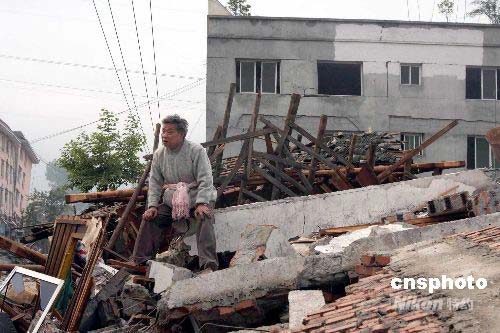 四川大地震,從都江堰到汶川縣映秀鎮(zhèn)沿線(xiàn)民房和交通受損嚴(yán)重,許多受困的居民紛紛離家趕往安全地點(diǎn),也有許多居民想回家看往地震區(qū)的親人。圖為14日 ,一直堅(jiān)信老伴還活著的居民在自家的廢墟前等待救援。中新社發(fā) 黃榮 攝