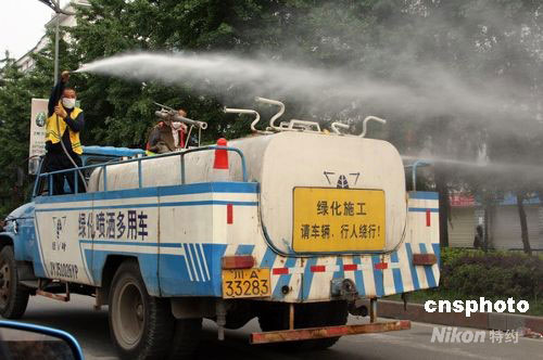 5月16日,四川都江堰市對(duì)市區(qū)及災(zāi)民安置點(diǎn)周邊環(huán)境進(jìn)行消毒,加強(qiáng)防疫工作。中新社發(fā) 張雷 攝